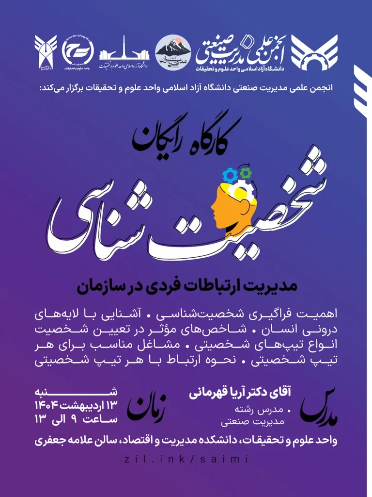 انجمن علمی مدیریت صنعتی دانشگاه آزاد اسلامی واحد علوم و تحقیقات برگزار میکند: کارگاه رایگان شخصیتشناسی مدیریت ارتباطات فردی در سازمان 👤 با تدریس آقای دکتر آریا قهرمانی درس رشته…